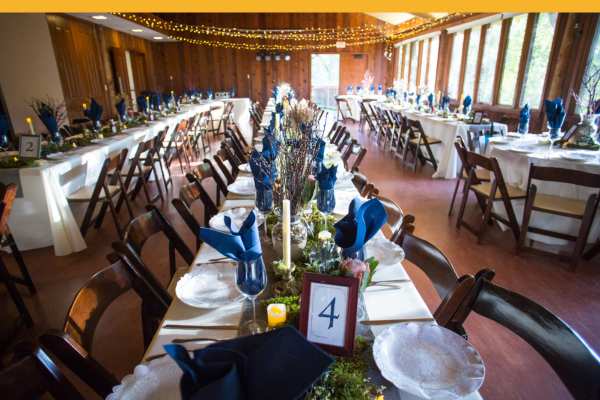 Host your next meeting, celebration, or special event in our beautiful riverside setting. Choose from the Main Lodge (seating up to 90), the intimate Em’s Cabin with gas fireplace, or the outdoor Sam & Gene Johnson Pavilion with fire pit. Our 78-acre preserve provides a stunning natural backdrop for weddings, corporate gatherings, and private events.